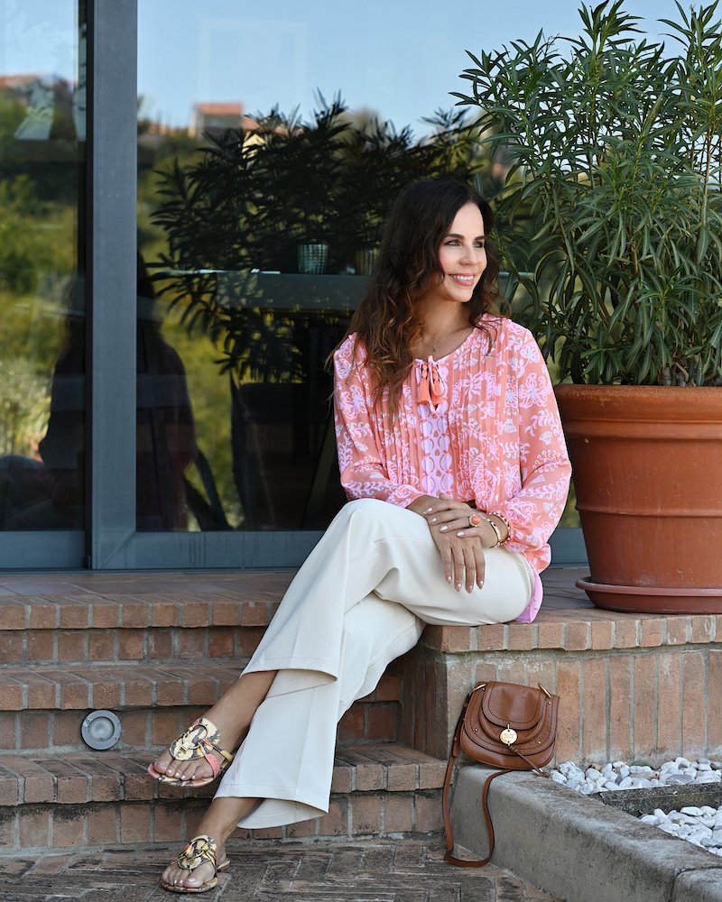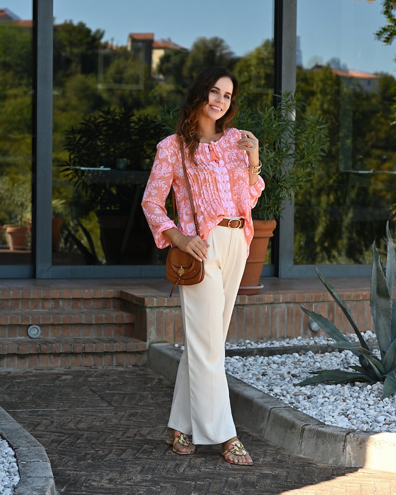 Today, I ventured into a color that I typically shy away from: a soft orange-pink silk blouse. While orange may not dominate my wardrobe palette, I’ve come to appreciate its vibrant and uplifting essence. Paired with elegantly tailored white trousers and effortless low sandals, this look not only feels sophisticated but also refreshingly relaxed. This ensemble serves as a delightful reminder that stepping beyond your usual style can lead to the most inspiring combinations. Orange isn’t just for summer—it’s a lively burst of energy that can infuse your day with positivity.