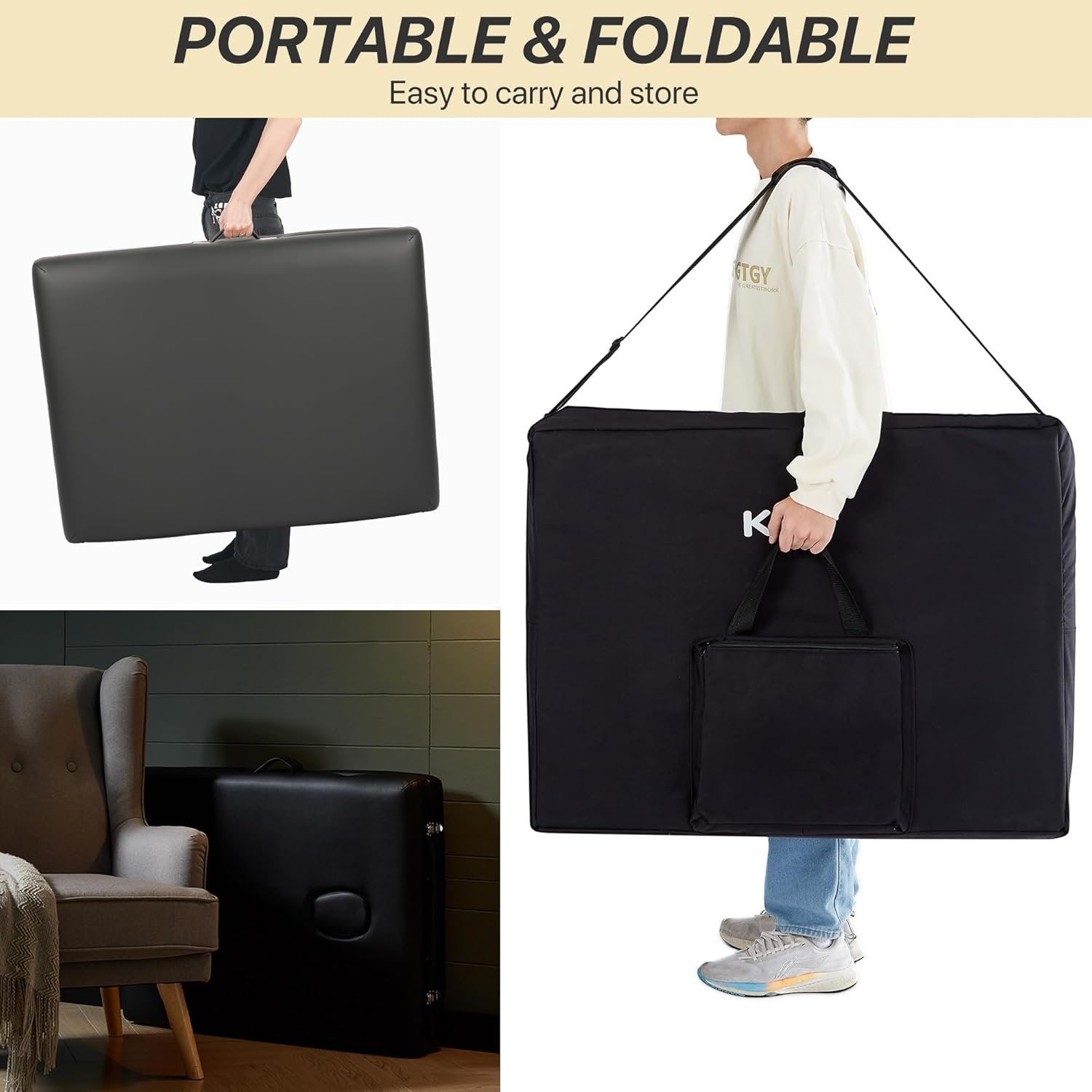 - Portable Design: Foldable and lightweight, it includes a stylish carrying bag with an adjustable strap for easy transport.