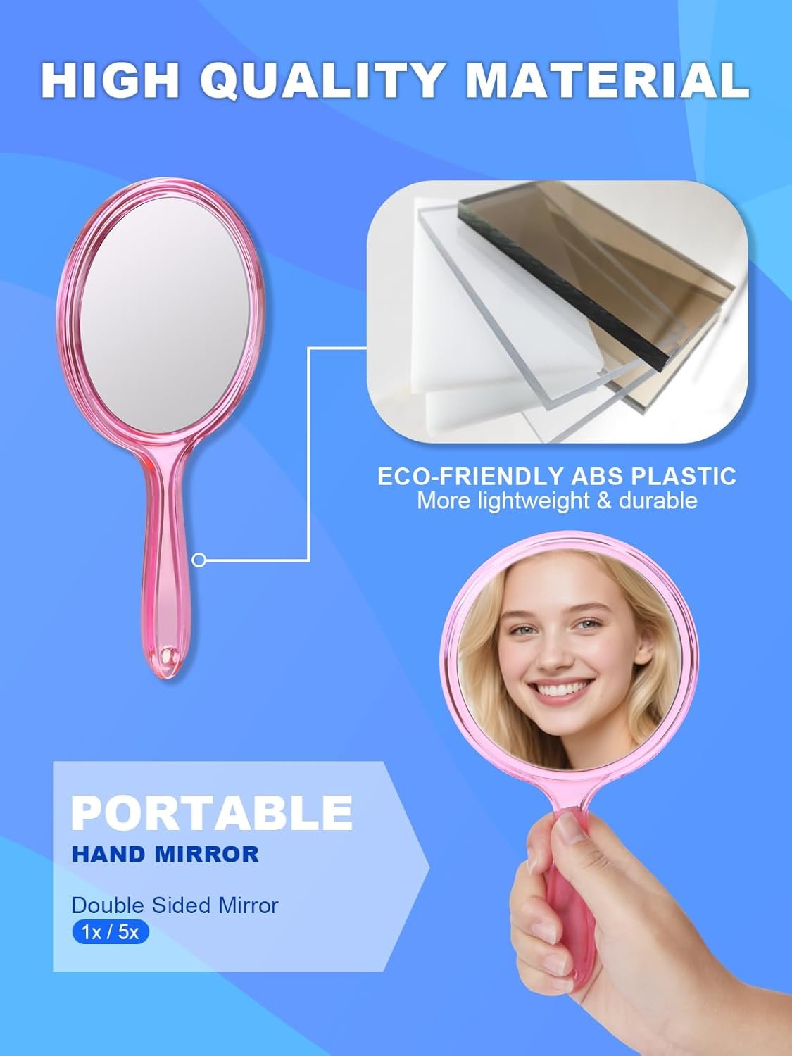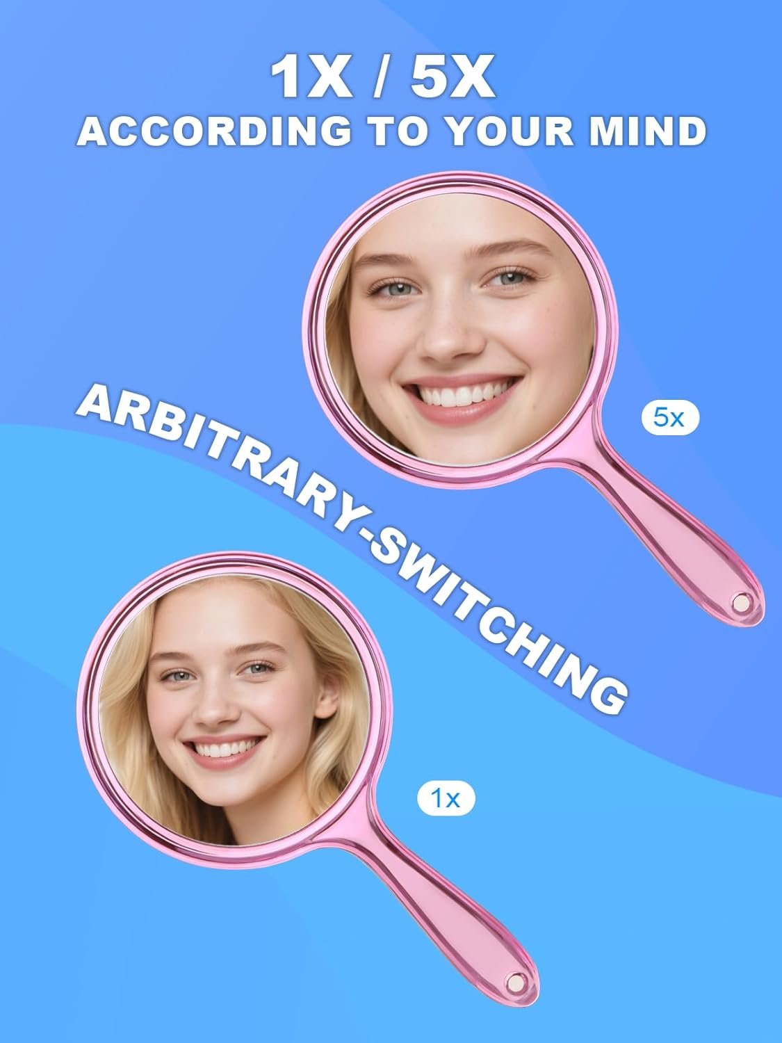 Pink Double-Sided Handheld Makeup Mirror, 10.5″x5.7″, 1X/5X