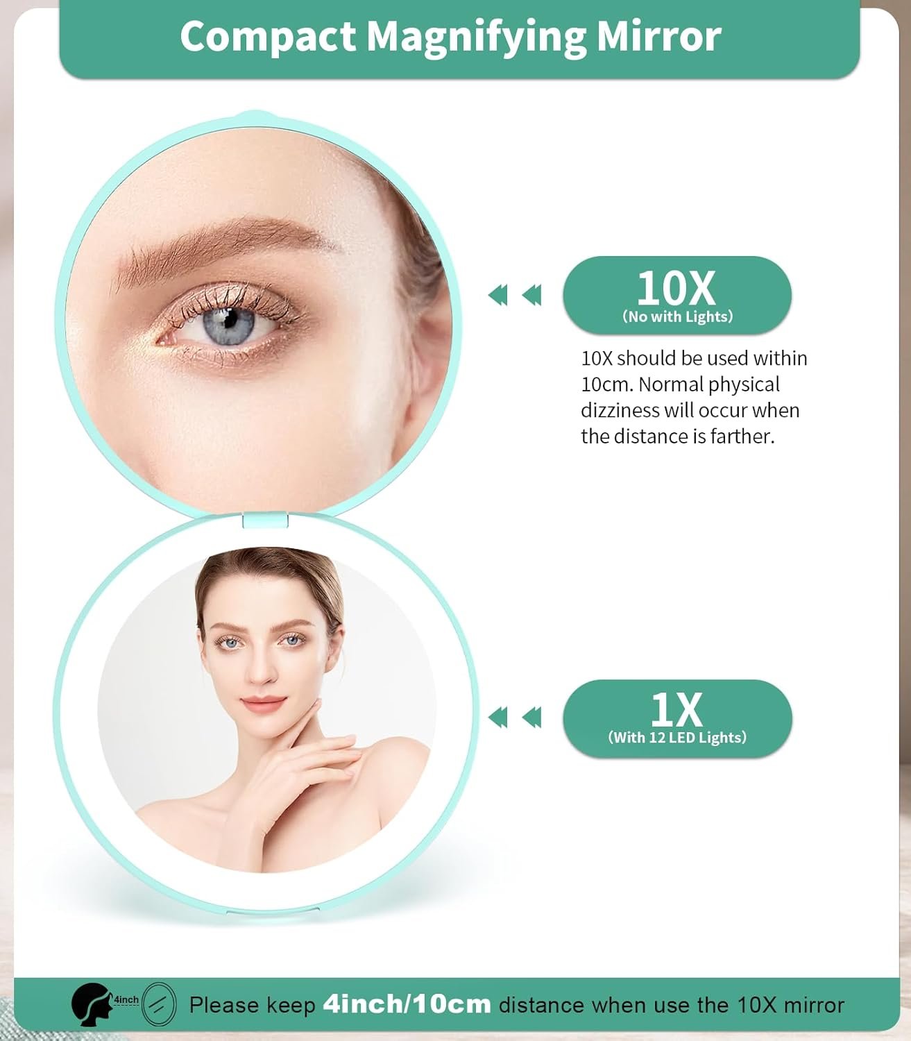 - 10x Magnification: Perfect for detailed makeup, shaving, or skincare—keep it within 10cm to avoid distortion.